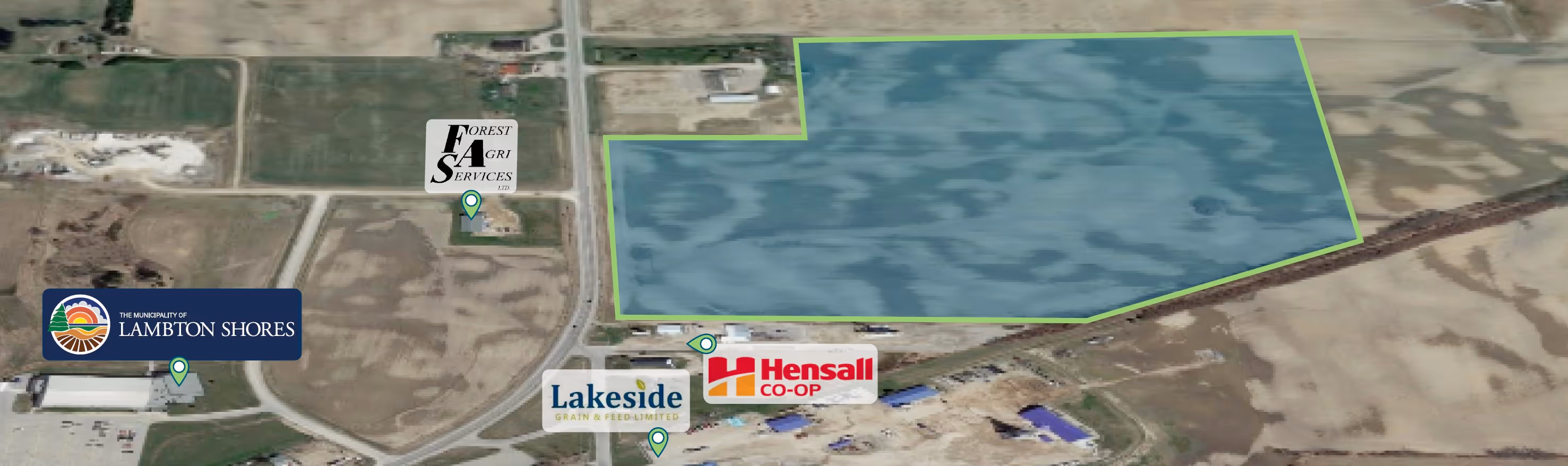 Located at 7914 Rawlings Road the Forest Industrial Park is a 55.7-acre fully serviced greenfield industrial property located in Lambton Shores. The municipally owned site is strategically established along Highway 21 in the community of Forest, only an 11-minute drive to provincial Highway 402 and in proximity to Sarnia, London, Windsor, and the US border. The town of Forest is a major service centre for the surrounding community, as well as a central commercial area, and home to a cluster of agriculture and industrial manufacturing companies. An additional 32-acres to the west of the property makes up the remainder of the Forest Industrial Park and may be available for development.
