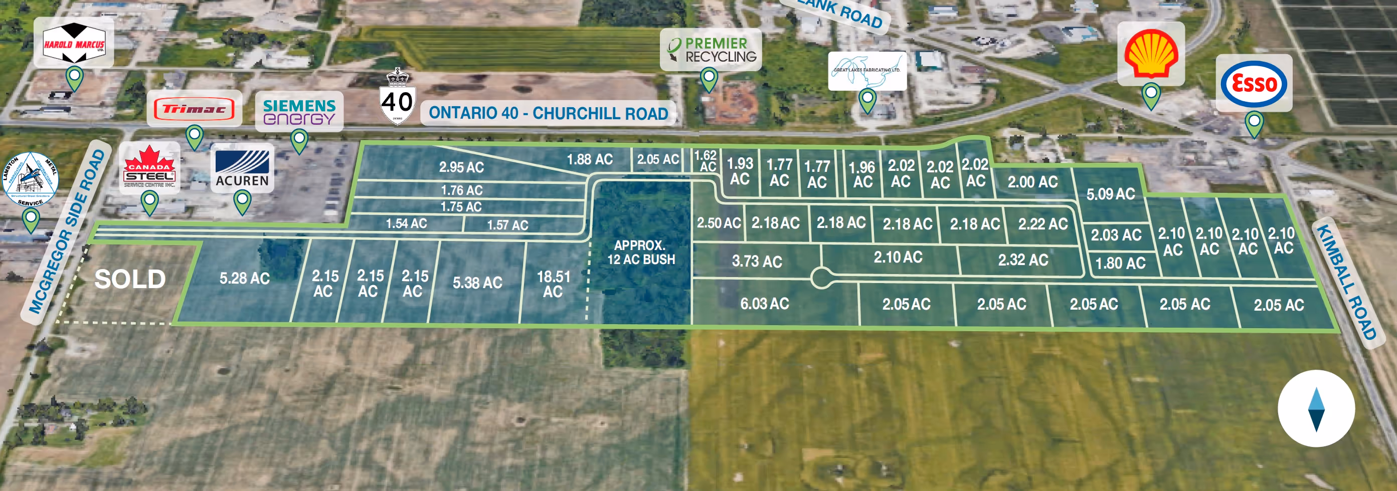 The HWY 40 Industrial Park extends along the south side of provincially regulated Highway 40 between frontages on McGregor Side Road and Kimball Road. A proposed internal road network will provide excellent transportation infrastructure for tenants of the industrial park.