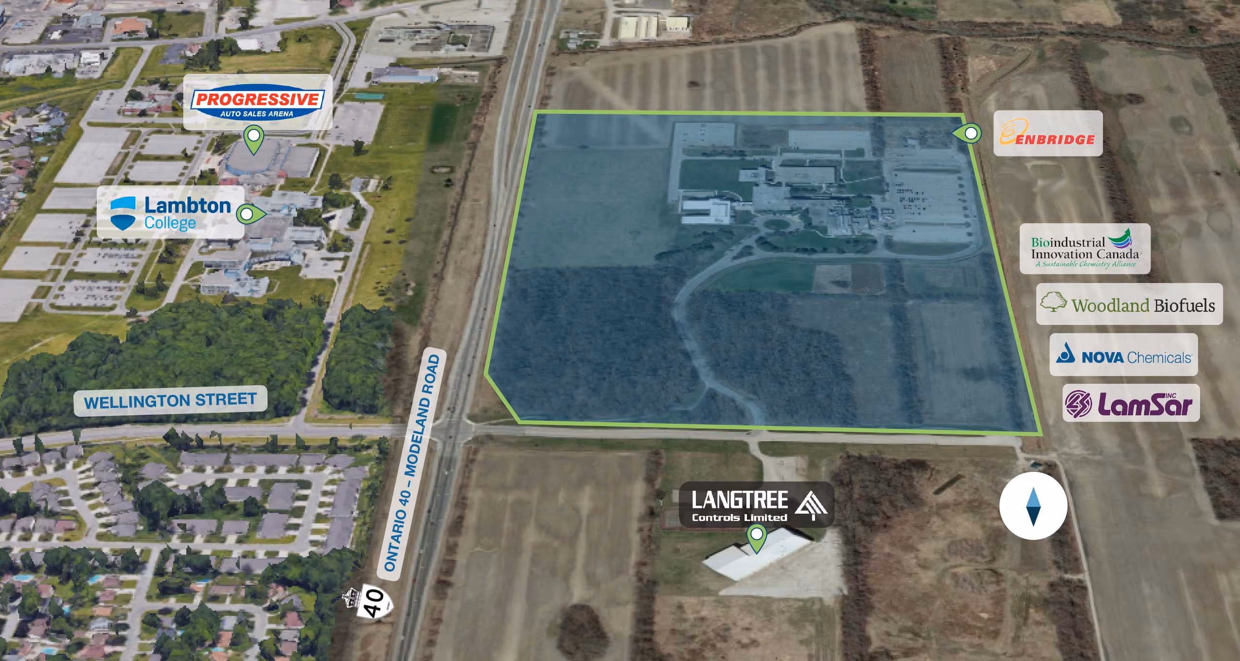The Western Sarnia-Lambton Research Park is ideally located adjacent to Highway 40 with immediate access via Wellington Street. An internal road provides access to buildings and parking throughout the complex.